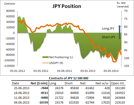 The yen is the leader by the largest net short position against the US dollar, despite its decline last week to -7.8 billion USD. The sentiment stays bearish.