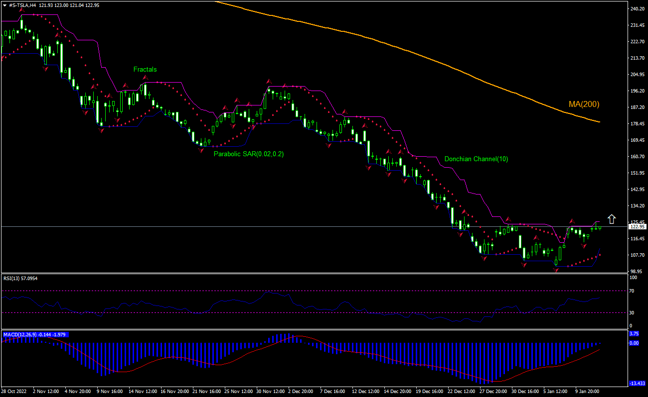 The technical analysis of the Tesla stock price chart on 4-hour timeframe shows #S-TSLA: H4 is rebounding toward the 200-period moving average MA(200) which is declining still. We believe the bullish momentum will continue after the price breaches above the upper boundary of Donchian channel at 125.67. This level can be used as an entry point for placing a pending order to buy. The stop loss can be placed below the fractal low at 114.76. After placing the order, the stop loss is to be moved every day to the next fractal low, following Parabolic signals. Thus, we are changing the expected profit/loss ratio to the breakeven point. If the price meets the stop loss level (114.76) without reaching the order (125.67), we recommend cancelling the order: the market has undergone internal changes which were not taken into account.