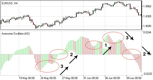 La Strategia dell'Awesome Oscillator comprende 3 modi di trading. Il primo modo è quello di aprire una posizione di vendita quando l'oscillatore è sotto la linea dello zero formando un picco, e aprire una posizione di acquisto quando l'oscillatore è sopra la linea dello zero formando un gap.