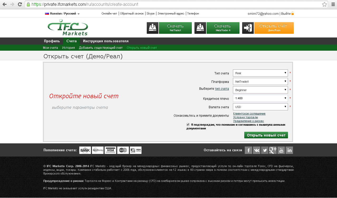 В этом окне выберите тип счета “Real”, платформу “NetTradeX”, тип счета, кредитное плечо и валюту счета. Ознакомьтесь с тремя документами – Клиентское соглашение, Условия торговли, Уведомление о рисках – и поставьте метку подтверждения.