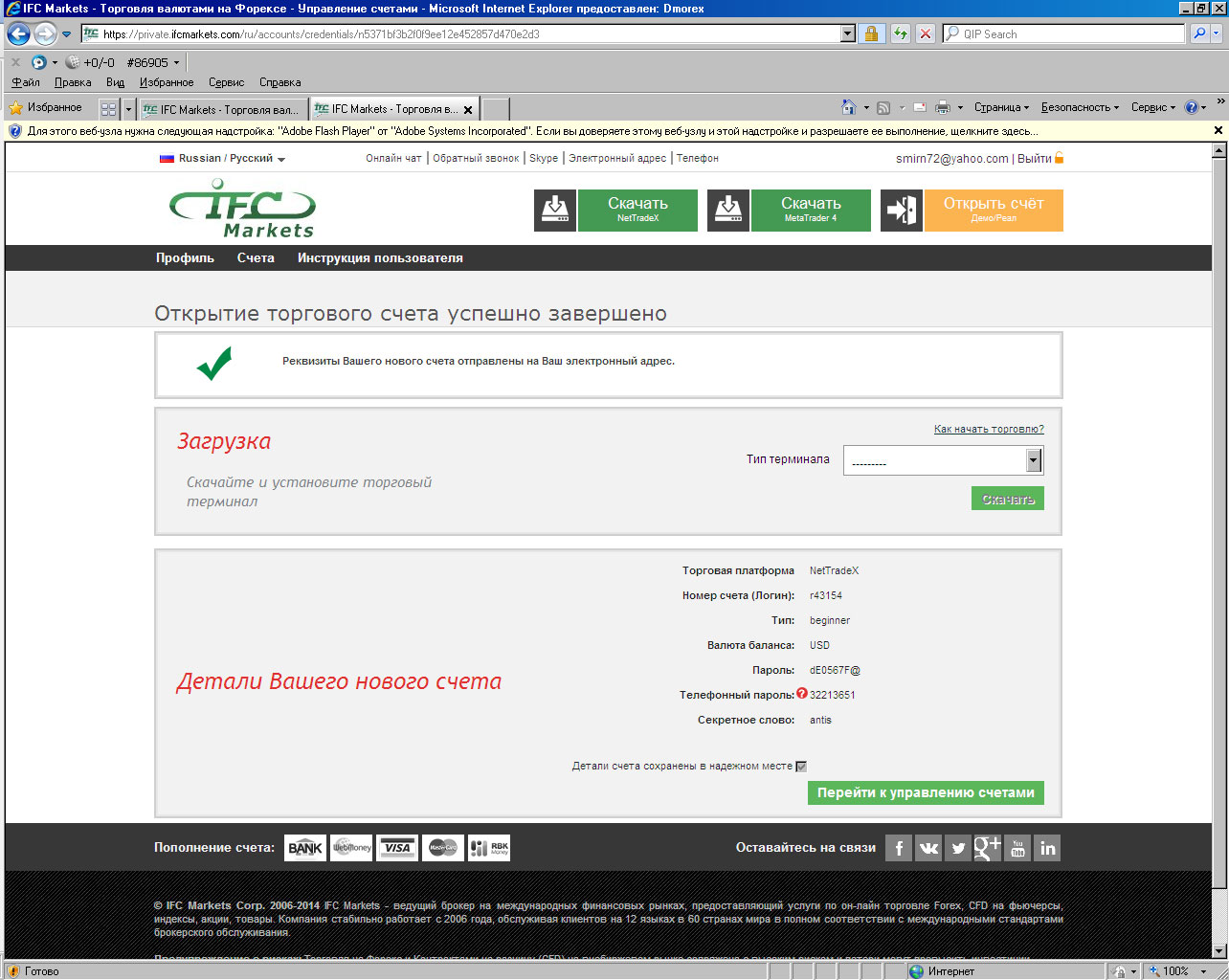 Если у Вас уже есть Личный кабинет (ЛК), то войдите в ваш ЛК из сайта IFC Markets по кнопке «Войти» или по кнопке «Открыть счет» - «Вход», задав свой Логин ЛК (равен Вашему e-mail) и пароль ЛК.